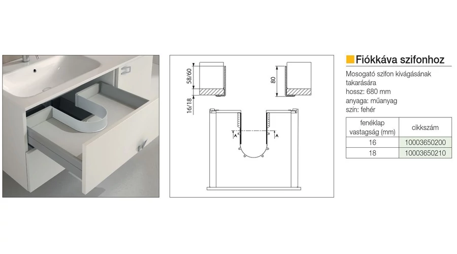 Mosogató vagy mosdó szifon kivágásának takarására. Lapvastagság: 18mm.