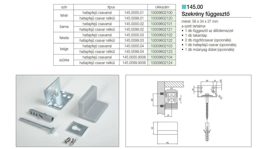 SZEKRÉNY FÜGGESZTŐ 145.0000.01 FÜGGESZTŐ TIPLIVEL 56x34x37mm FEHÉR